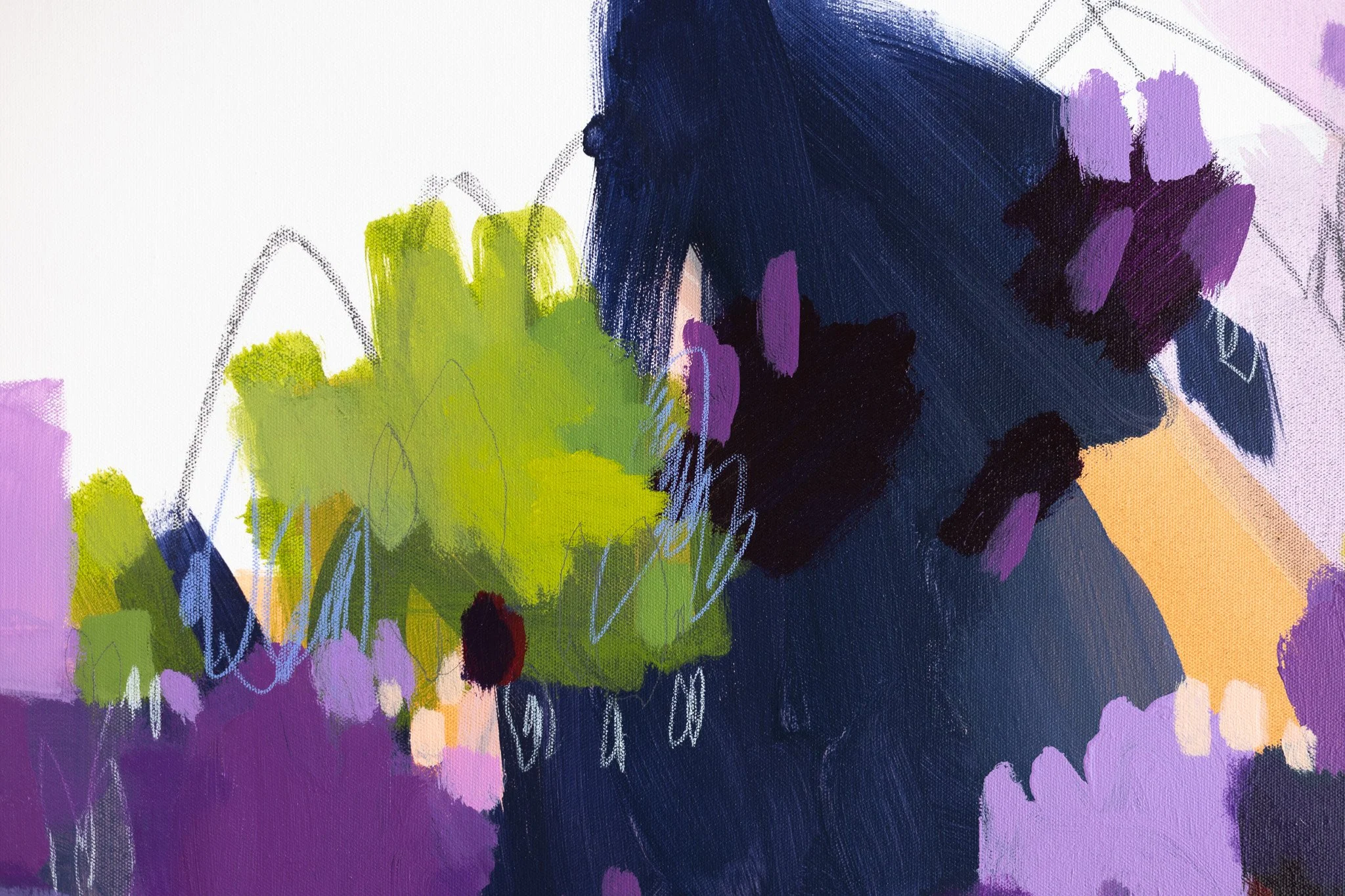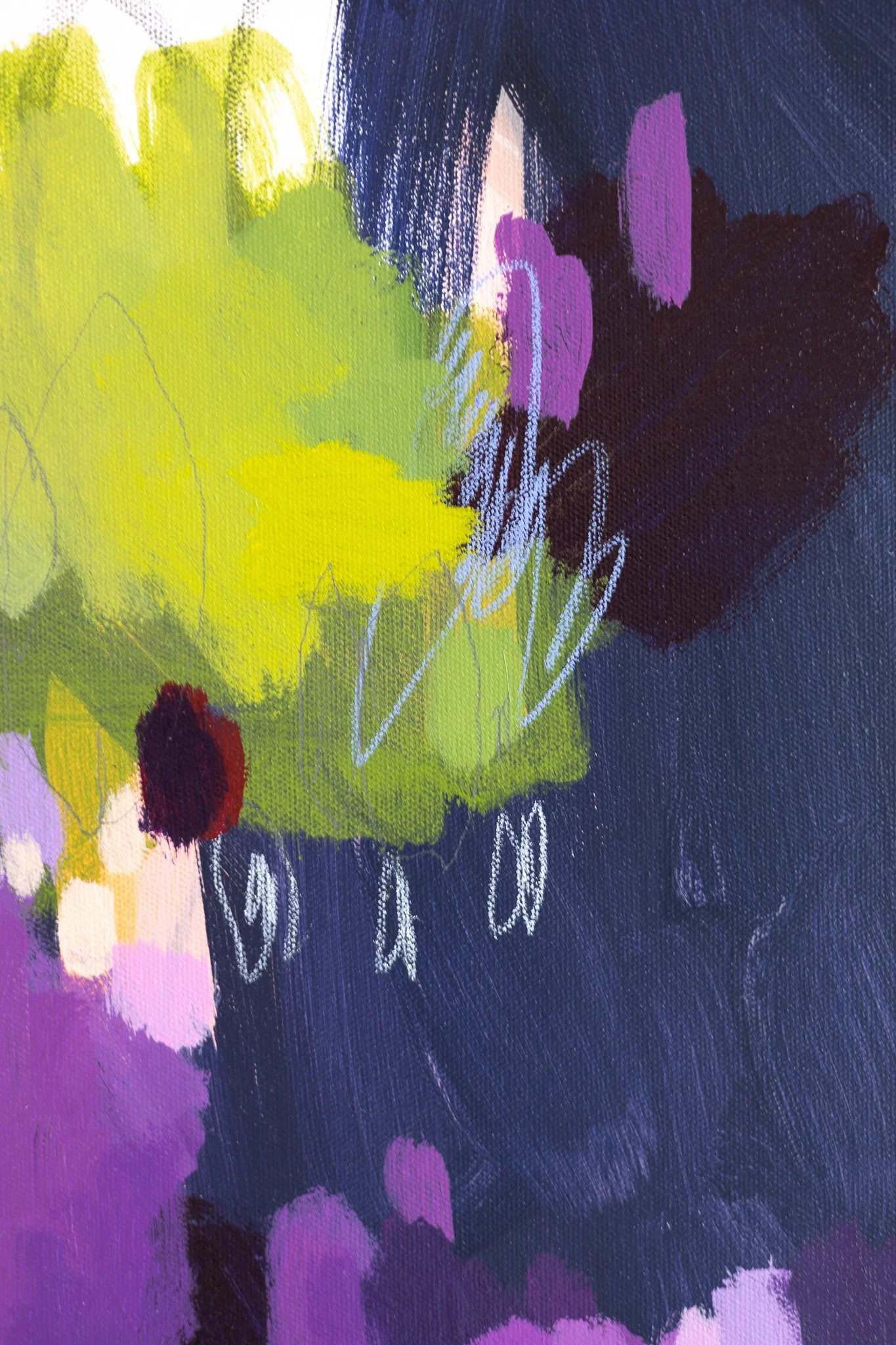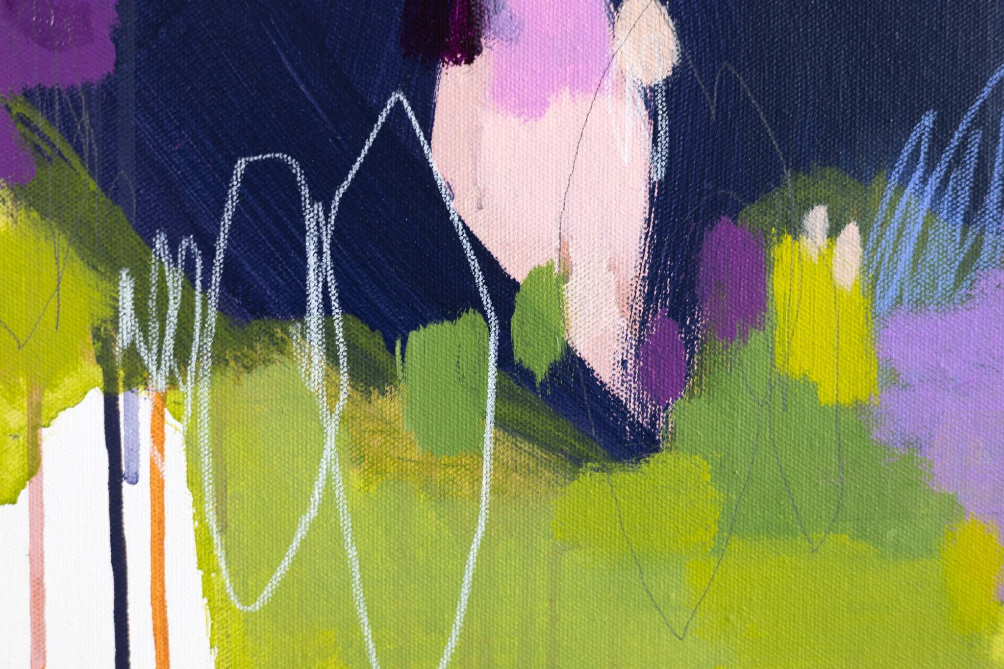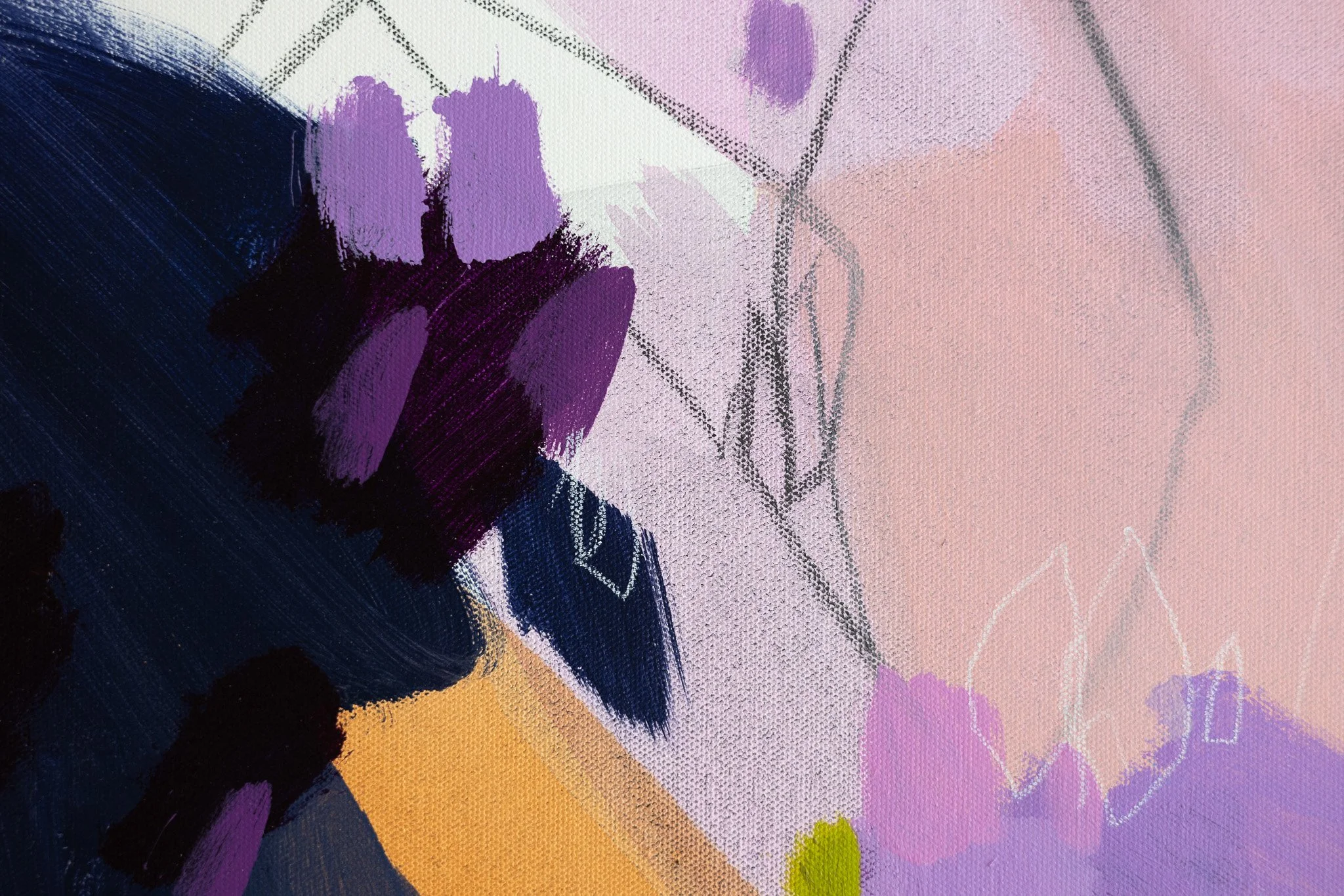 This original artwork on canvas is a mixed media work, featuring acrylic paint, crayon and graphite.